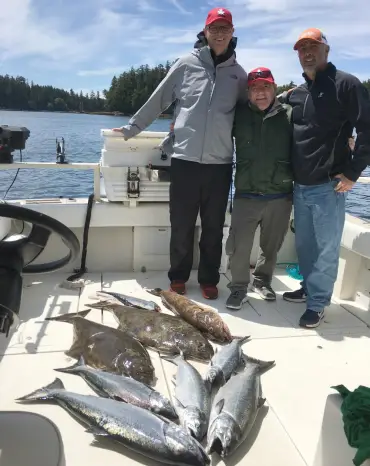 The Ucluelet waters hold salmon and halibut because they also hold Herring, Pilchards, Squid, and Krill – bait fish. The main species of salmon that feed in these areas are Chinook (King) salmon, Coho (Silver) salmon, and Sockeye salmon. Generally, we don’t target Sockeye salmon in Ucluelet, as they bite better in the Port Alberni inlet, but we do occasionally catch Sockeye while fishing for Chinook.Fair-weather anglers? We’ve got you covered